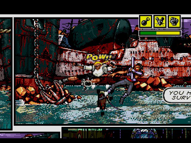 It is no exaggeration to say that Comix Zone is one of the most difficult games of its era. Both puzzles and combat present a significant challenge. You do not face continuous waves of enemies: in any given room you will face maybe two or three. However their AI is ruthless as they are aggressive and know how to block and counter your attacks. Few encounters will end without you taking damage. It says a lot when the bosses are easier than the regular enemies. Healing items are rare and they do not restore your life between levels! To make matters worse you have one life with no passwords or battery backup to save progress. You can earn continues but it is extremely hard. They stack the deck against you pretty heavily.
