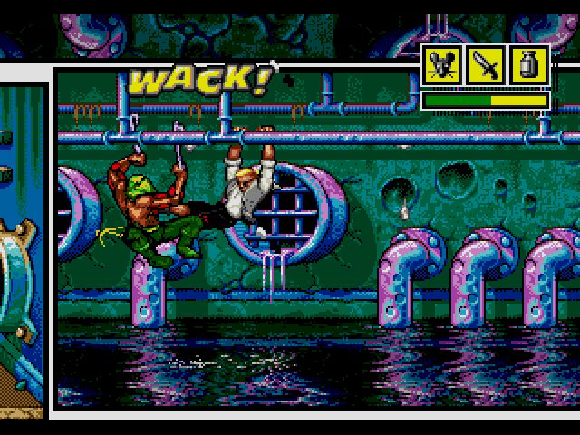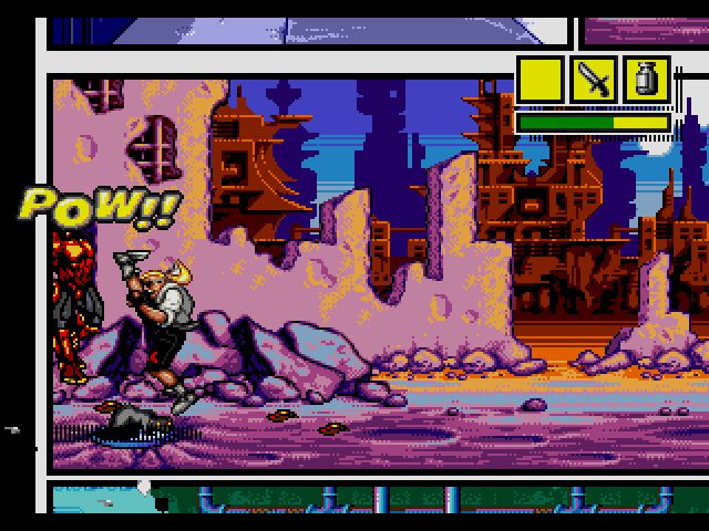 Comix Zone is a single lane beat em up with a simple control scheme. There is only one attack button however in combination with the d-pad you can execute a variety of moves. Sweeping attacks, high kicks, uppercuts, throws, and a few leaping attacks round out your arsenal. Admittedly next to later brawlers from that generation it is simple. But it is just enough to get the job done. In addition you can carry three items in your inventory including weapons like grenades, health, and an item that turns you in to a super hero.