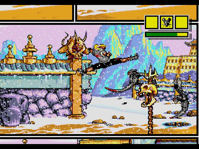 While it is easy to call Comix Zone a brawler it is more than that. The game has elements of platforming and puzzle solving making it a hybrid. It is this element that trips up first time players and leads to early deaths. As you move from panel to panel you will beat up a few enemies before progressing or must solve a puzzle. Some of these are immediately obvious such as destroying rocks blocking your progress. Others require Roadkill to activate switches or tear off the background to reveal necessary items. Solving puzzles will usually reward items or reveal alternate paths which are cool. The game tries to nudge you but is not always clear. Even worse it is easy to screw up and have to sacrifice precious health in order to move on. This would not be so bad if the game were not so ridiculously fucking difficult.