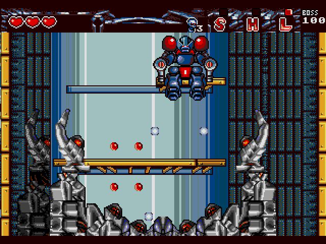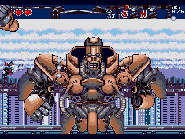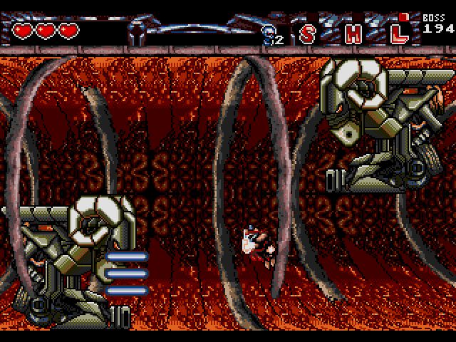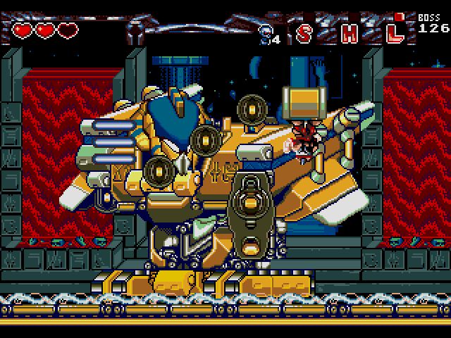 The game revels in its homages to action classics from the past. Many of the bosses are multi-jointed wonders that would not look out of place in Contra: Hard Corps. There are many tips of the hat to Gunstar, especially in stage five. I will be honest some of the bosses might be a little too close to Treasure’s work and cross in to plagiarism and not homage territory. There is even a reference to Metal Slug 3, albeit in lesser form. I respect the attempt though. Some of the later shooter levels resemble R-Type as you fly around a massive battle ship and dismantle its defenses piece by piece. Despite these homages the Cursed Knight does not lose its identity. I do wish the story were better as it would have made the game more distinct rather than a bit cliché. But I digress.