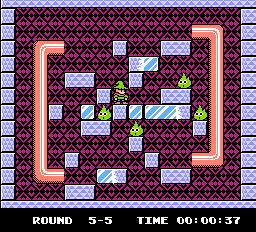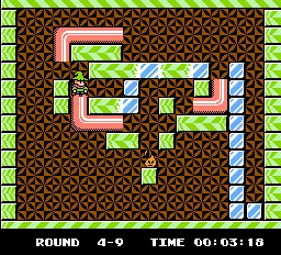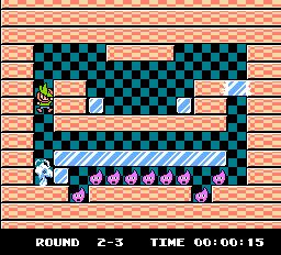The gradual curve manifests in numerous ways. Fire ‘n Ice eases you in to its mechanics and only introduces more advanced ideas such as pipes and jars at the halfway point. Although the complexity of the puzzles increases it is not always linear. Sometimes you will have a few easy ones you can complete in less than a minute before running in to an intricate beast that takes five times as long. Tecmo have also made the game more accessible. Levels are not timed; the clock is there just to see how long it takes for completion. There are no lives and you can restart a level as much as you want. There are also unlimited continues and passwords after every stage. Most importantly you can choose any level at any time, letting you skip particularly troublesome stages and return later.