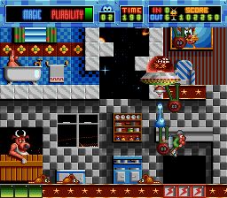 Putty Moon, the place where Putty lives, has been taken over by an evil wizard named Dazzledaze. Dazzledaze planned to capture the Putties and ship them to Earth as gum. To save his friends and oust the evil wizard, Billy Putty enlists the help of some robots (“bots”) to build a skyscraper that will reach up to Putty Moon. Super Putty is a port of the Amiga game Putty. The two games are virtually identical outside of the SNES game using nearly all of the controller’s buttons. While the port is admirable I do wish they did a balance pass as it becomes frustrating in short order. Whether that is enough to turn you away comes down to personal preference.